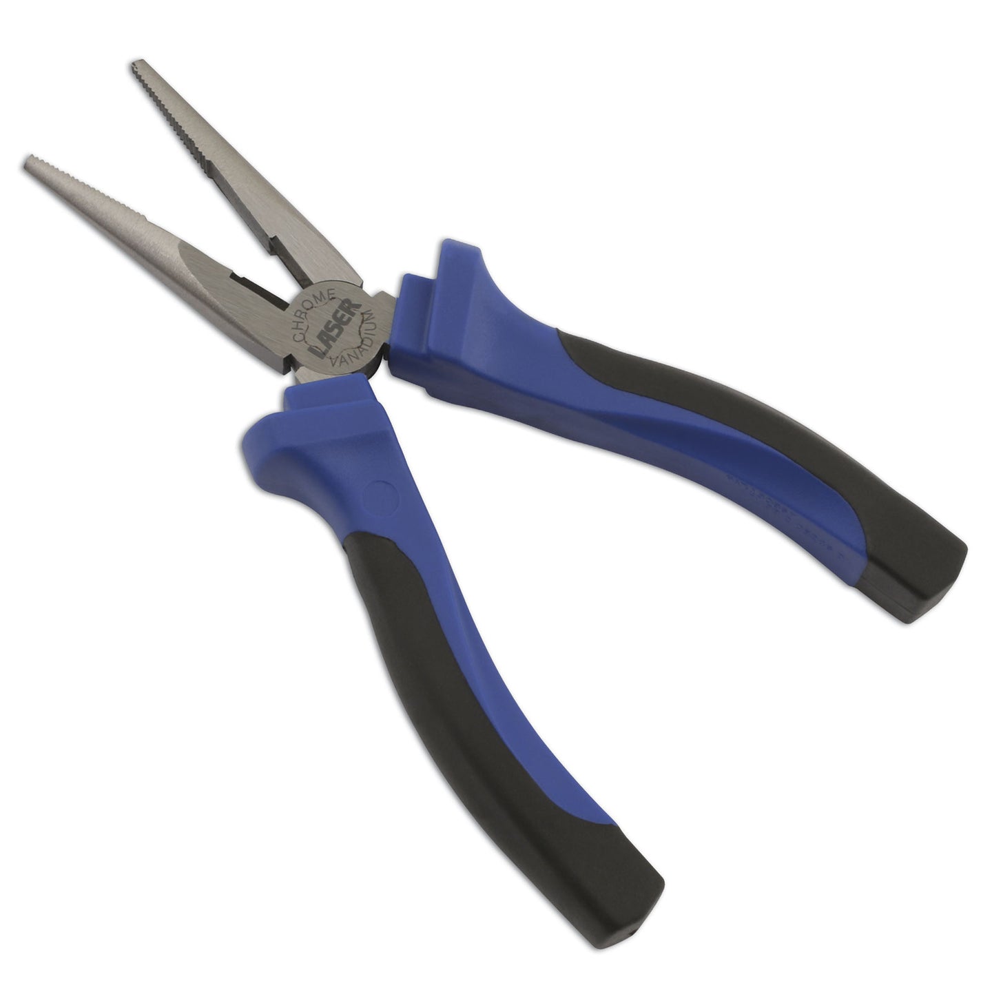 -15%High strength long nose pliers, part of the Laser Tools professional range. Compact size, 150mm long, with serrated grip jaws and a jaw capacity of 24.6mm. Durable chrome vanadium construction with slim, hardened, polished jaws and integrated wire cutters. The pliers have ergonomic, soft grip handles with safety hand stops.