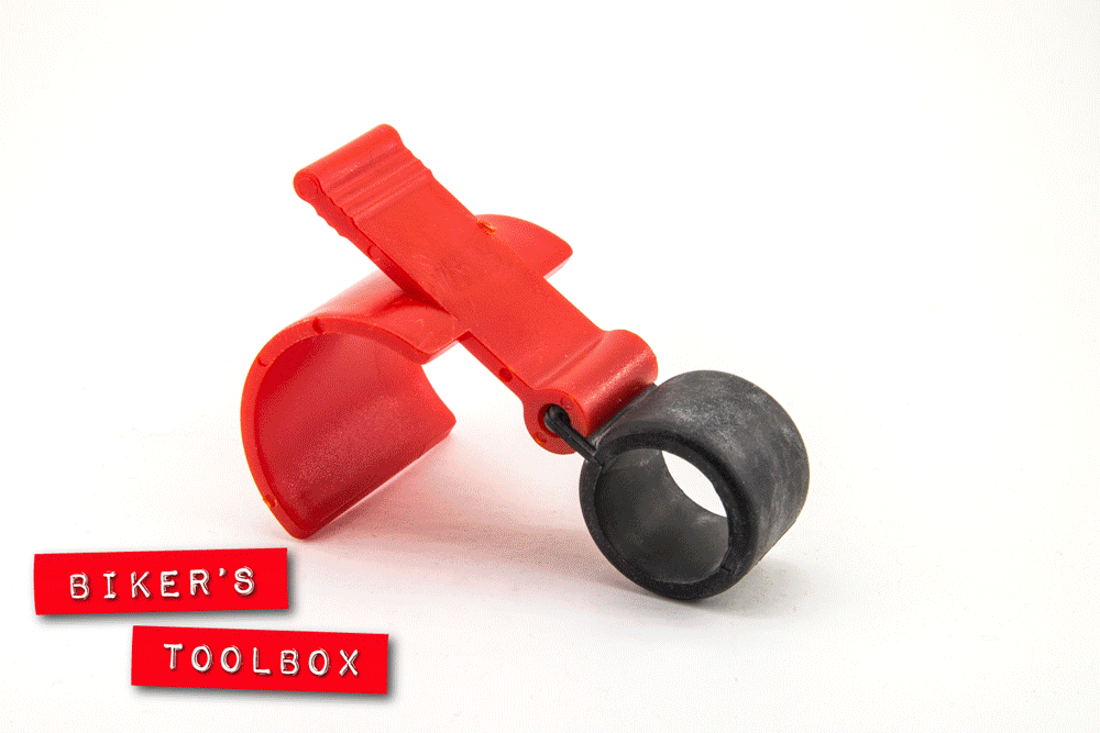 When you've got a bit of air in a brake system that just wont shift, slipping this handy tool over the front brake lever will hold the brake on hard and thereby effectively leave the master cylinder valve open so that any air bubble in the system, over time will find their way out again. If it's a real pig, leave it on over night and in the morning you will wake up to a nice stiff brake.