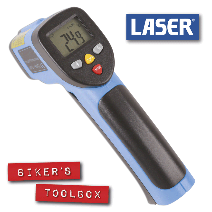 -26%These are great for rapidly working out which cylinder or cylinders are miss firing on a multi cylinder engine, simply by measuring the temperature of the exhaust headers. In the old days we would spit on a finger and gently touch the exhaust header determining the hottest by the sound of boiling spit or the smell and accompanying pain of burning flesh, if one wasn't quick enough. Having used both methods, all at Biker's Toolbox agree that for slightly over thirty quid it's a no brainer. - Range -50° to +650°C (-58° to +1202°F), selectable from Fahrenheit to centigrade. Includes backlight, hold and MIN/MAX data recording. - CE, UKCA & RoHS compliant. - Distance to spot 12:1. - 1 x 9V battery - Auto power off with automatic data hold and laser target pointer.