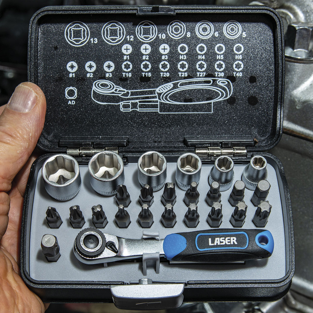 Miniature socket and bit set, with satin finish chrome vanadium sockets from 5mm to 13mm and S2 steel impact grade bits.
