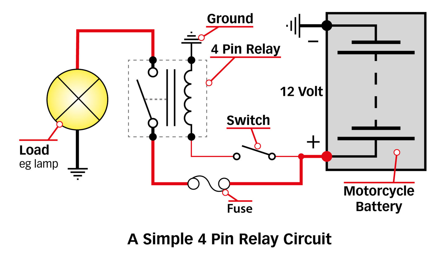 Micro relays are perfect for motorcycles where there is always a space and weight issue. Very rarely will you ever need more than 20amps (240watts @ 12 volts). Very often horns use more current than is wise to draw through the handle bar switch, especially if you use a louder snail horn or similar to make your presence on the road apparent to the seemingly psychopathic car drivers out to get you. Relays are very simple to use. Below is a very simple diagram showing how a relay is used to switch a lamp. What you are doing is to draw a very low current through your handle bar switch to power an electromagnet which operates a much heavier switch to power the load.