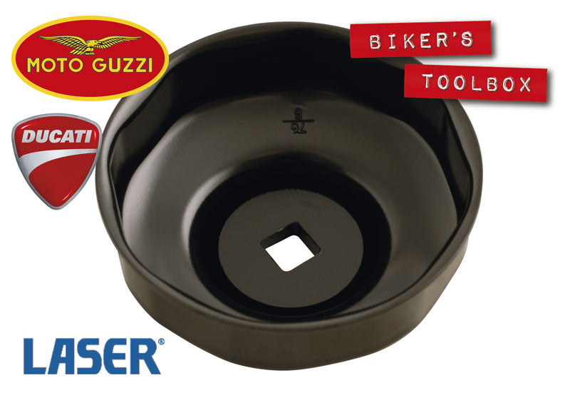 3/8" drive cup style oil filter wrench suitable for a number of Ducati and Moto Guzzi (including 1100sports with separate sump filter cover) V11 California 1100, 850, 1000, '98, Centauro and Daytona) We don't have an exhaustive list of bike this tool fits, but if your oil filter has 8 sides and measures 76mm across the flats then it's the tool you need.