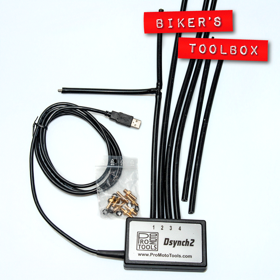 This is more, much more, than a PC based vacuum gauge set. The software runs on a standard Windows PC and shows a huge amount of data gleaned from intake vacuum measurements. It displays the average vacuum on a bar chart for carb/throttle body balancing but also plots the vacuum on a graph against time from which you can detect issues such as leaking inlet rubbers as well as poor seating of exhaust and inlet valves. If you really read up on the significance of the graph traces you can identify more complex issues with the carbs/throttle bodies. Each cylinder is given a colour, No 1 Black, 2 Green, 3 Red and 4 Yellow making it easier to distinguish between the graph traces. The software is easy to use and provides a plethora of data including minimum and maximum vacuum for each inlet as well as average figures. One can switch on and off inputs in the software to get a clearer look at individual cylinders. The software will record a diagnostic session which can be played back at any time for reappraisal or just to impress your mates down the pub. The recorded session can be played back as though it were a master video with full functionality ie you can turn on and off channels zoom in etc. For simply balancing carburettors or throttle bodies it makes life very easy. As with any vacuum analysing tool you connect the pipes to the intake outlets which are sometimes on the carbs or little stub pipes on the inlet rubbers as in the case of Kawasaki's mighty Z1 series bikes. The little black box is then plugged into the USB port of your Windows laptop and the software is easily downloaded from the website and installed. I am very reluctant and impatient when it comes to learning new software, but fortunately this is so easy to use I found a bit of poking here and there with a mouse and all was working without resorting to a manual. When balancing carbs/throttle bodies the bar graph background turns green when they are well within tolerance which makes it so easy. The Dsynch2 is supplied in a plastic case.